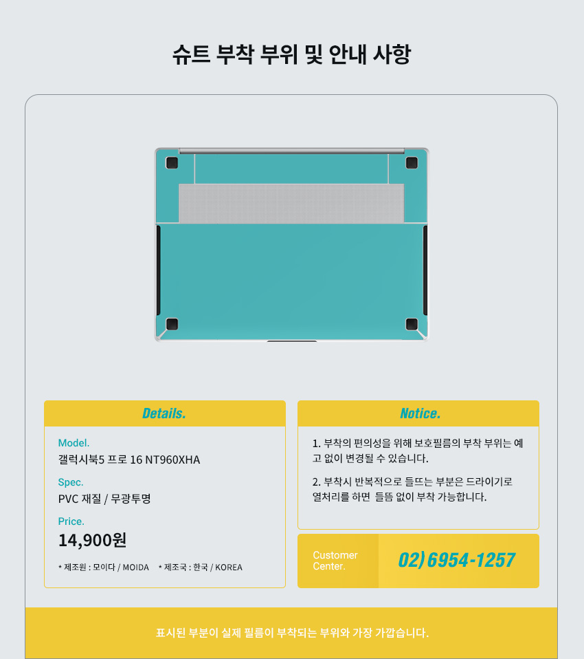 | 품명 및 모델명 | 갤럭시북5 프로 16 NT960XHA 하판 서피스 보호필름 2매 / UT250166 | ||