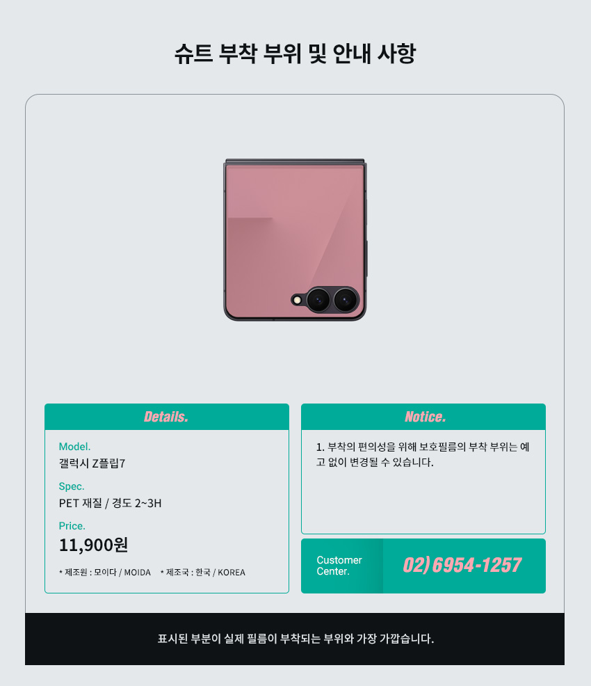 | 품명 및 모델명 | 갤럭시 Z플립7 지문방지 저반사 전면(풀커버형) 2매+서피스(힌지/후면) 2종 세트 각 2매 / UT260123 | ||
